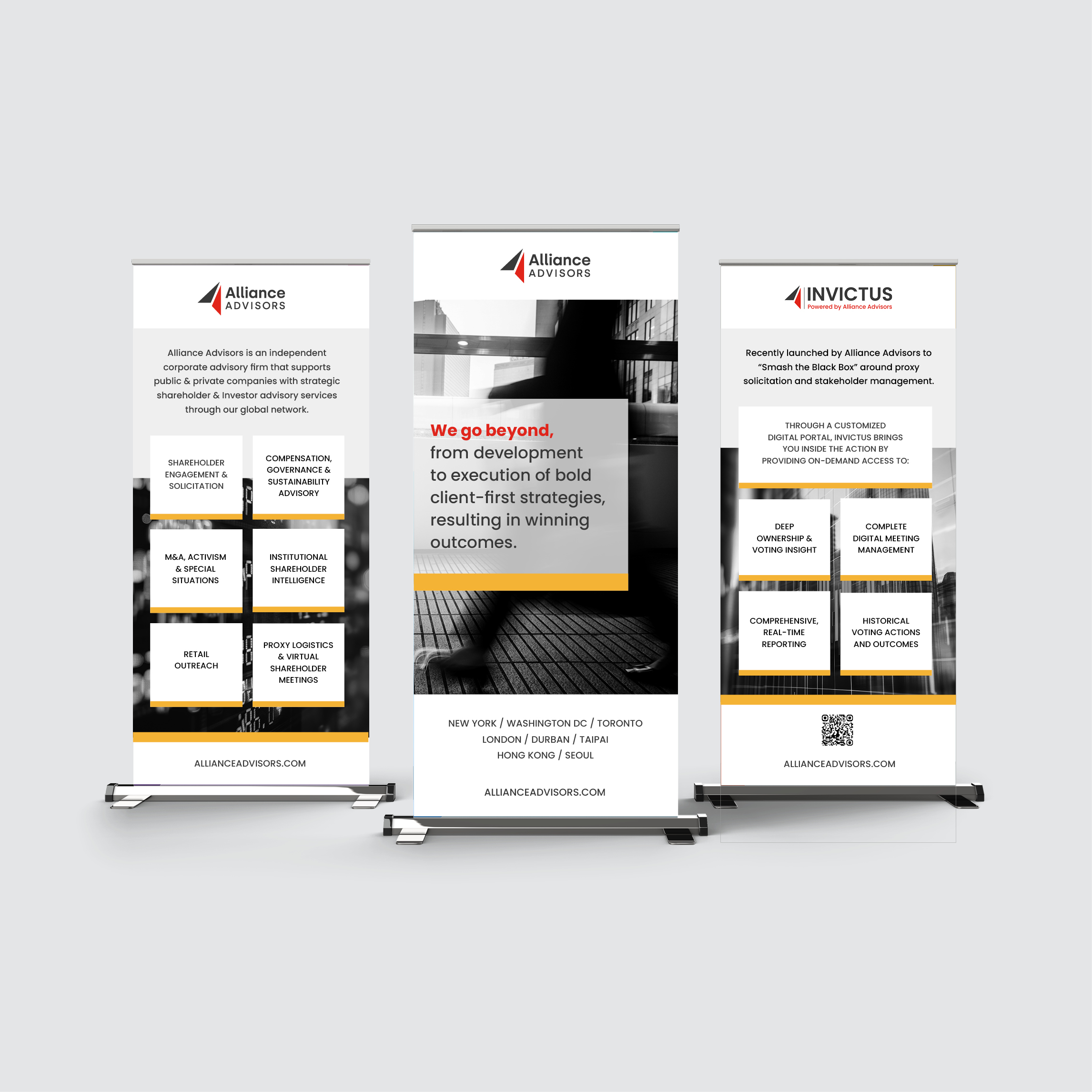 A complete rebrand including the Brand Mark, Website and all comms for Alliance Advisors – an independent advisory firm focused on Shareholder Engagement & Solicitation, Compensation, Governance & Sustainability Advisory, M&A – Activism, Institutional Ownership Intelligence, Proxy Logistics and Retail Outreach Strategies.